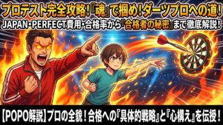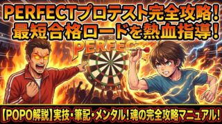 PERFECTダーツプロテストの完全攻略ガイド。実技・筆記・メンタル対策から受験資格、費用、当日の流れまで、POPO先生が熱血指導!最短でダーツプロになるための具体的な練習法や必勝戦略で、あなたの夢を確実に掴みましょう。