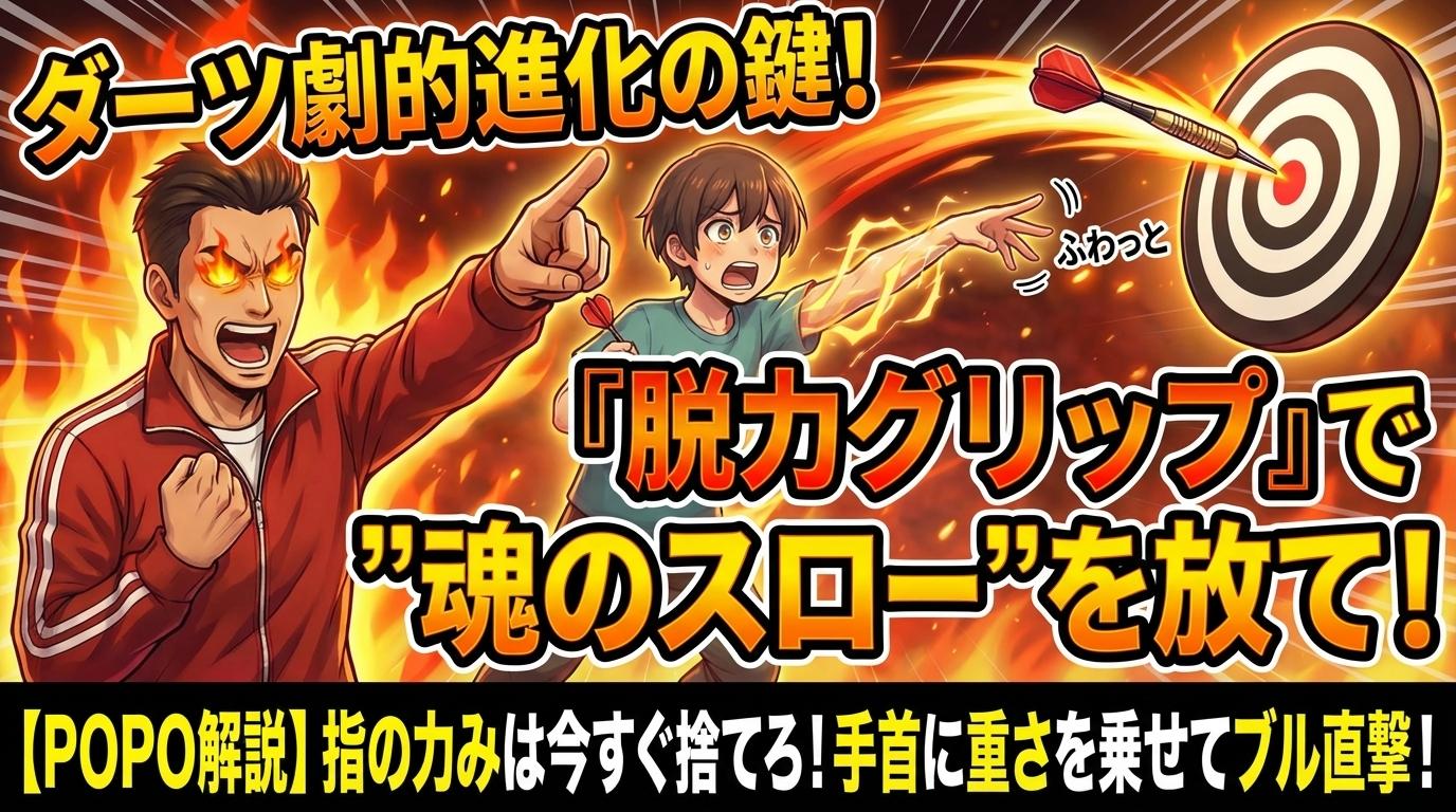 ダーツは「指でガチガチに握りしめるもんじゃない」んだ!!手首に「フワッと重さを乗せて」、しなやかに「ムチのように」使うんだ!!この感覚こそが、ダーツが持つ本来のポテンシャルを引き出し、君のダーツを「別次元」へと導くんだぜ!!